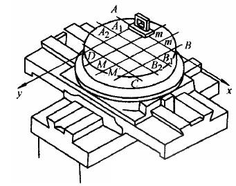 5、机床工作台面的平面度检验方法如图4所示,工作台及床鞍分别置于行程的中间位置,在工作台面上放一桥板,其上放水平仪,分别沿图示各测量方向移动桥板,每隔桥板跨距d记录一次水平仪读数。通过工作台面上A、B、D三点建立基准平面,根据水平仪读数求得各测点平面的坐标值。